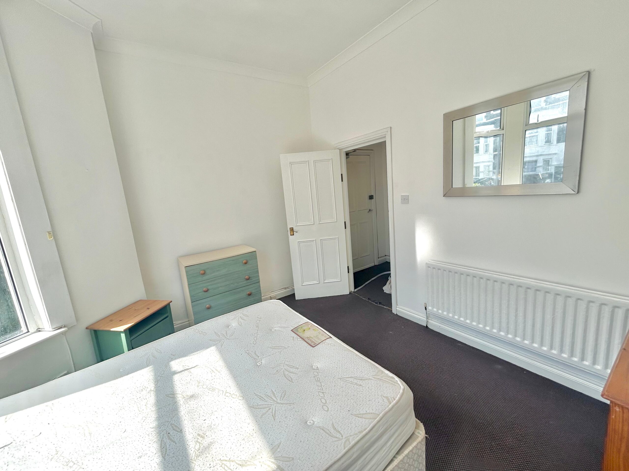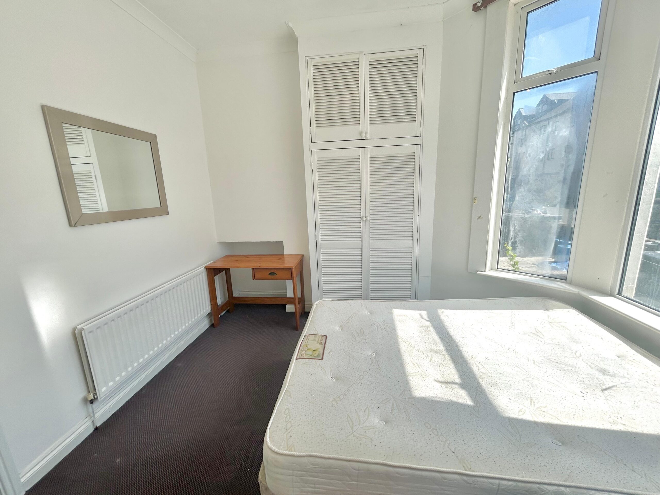 The apartment benefits from an OPEN PLAN kitchen lounge with a patio door opening onto the shared outdoor area, allowing natural lighting. The living area comes fully furnished with a two-seater sofa and a coffee table. The kitchen has all essential appliances such as fridge freezer, washing machine, modern oven, and hob! Across the hall you have the bathroom and bedroom, bedroom is placed at the front of the property with a huge bay window – benefits from natural lighting! The bedroom comes fully furnished with double bed, mattress, built in wardrobes, set of drawers, desk, and chair.
