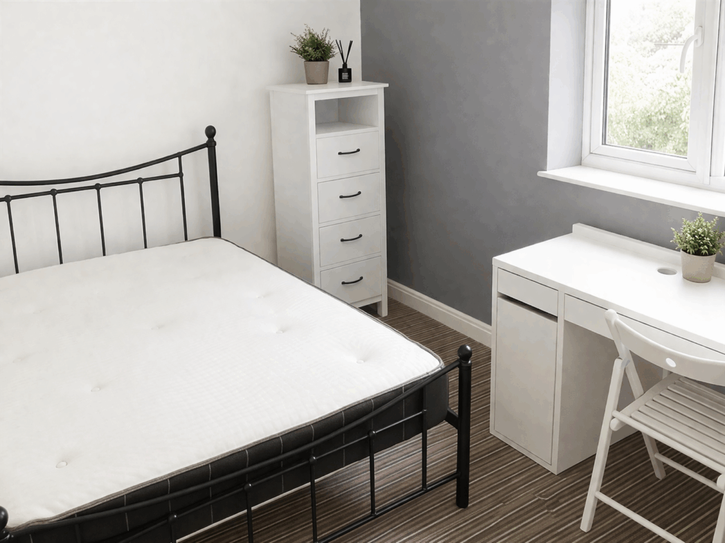 All 12 bedrooms benefit from natural lighting, are generously sized, and come fully furnished. Each room includes a double bed, mattress, wardrobe, desk, and chair. All windows are fitted with curtains or blinds.