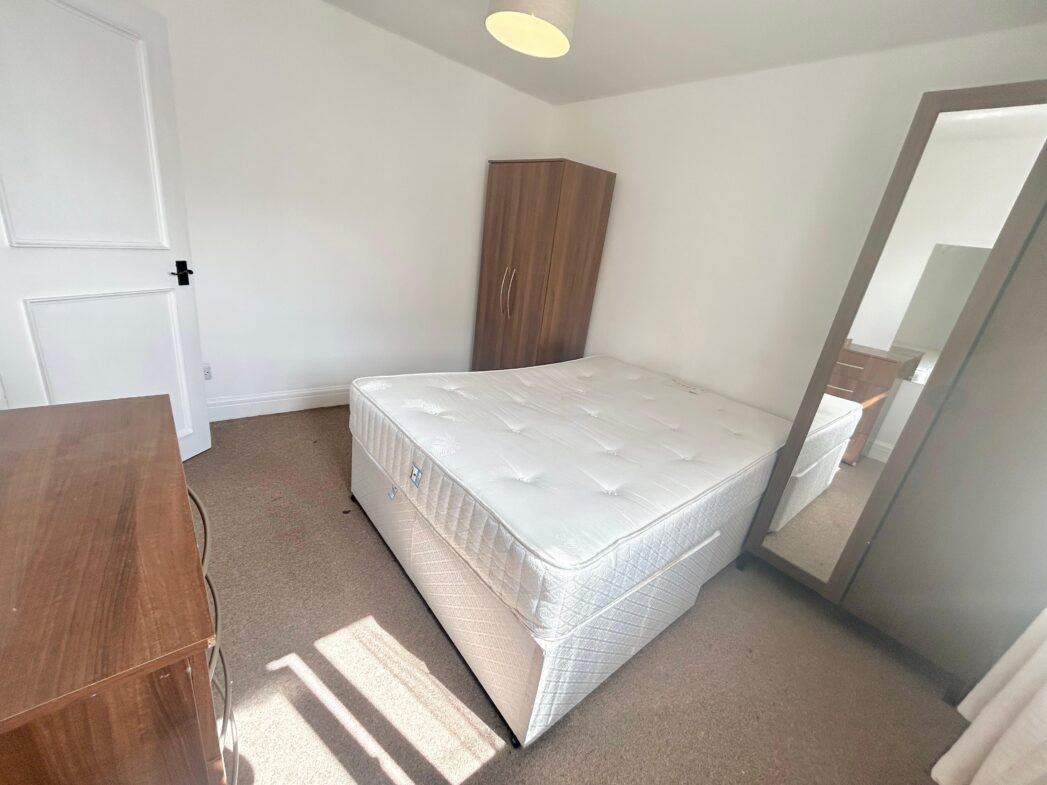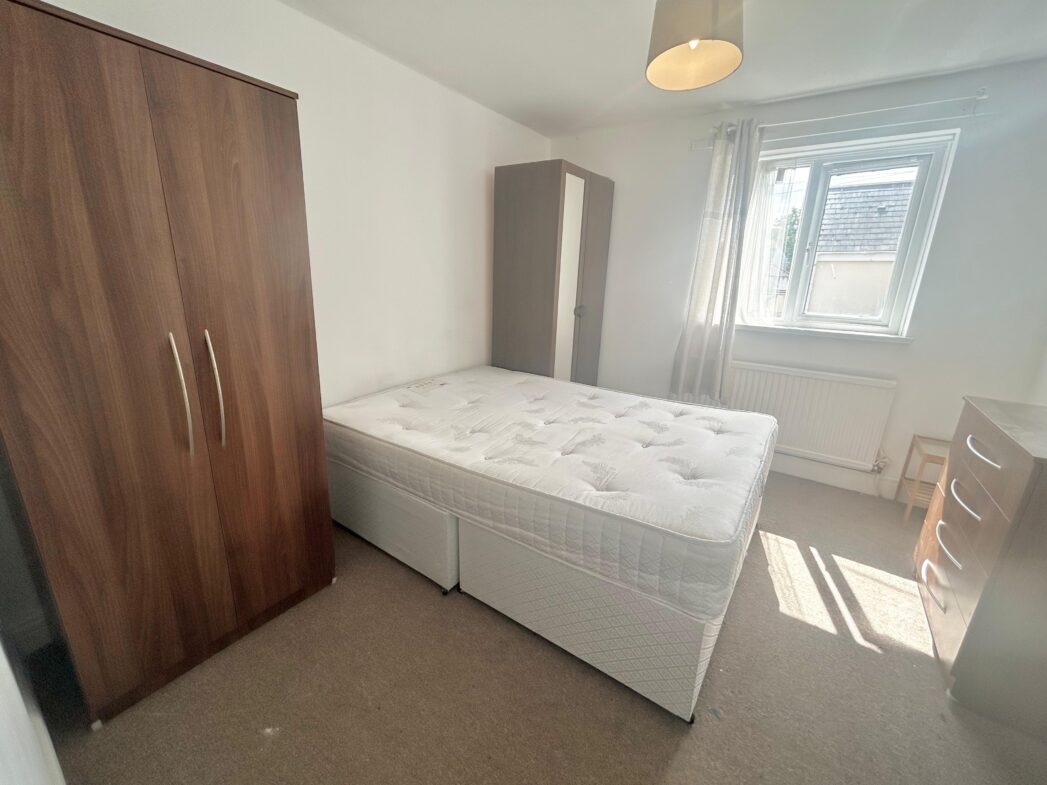 The bedroom benefits from a large window allowing natural lighting and comes fully furnished with a double bed, mattress, wardrobe and a set of drawers.